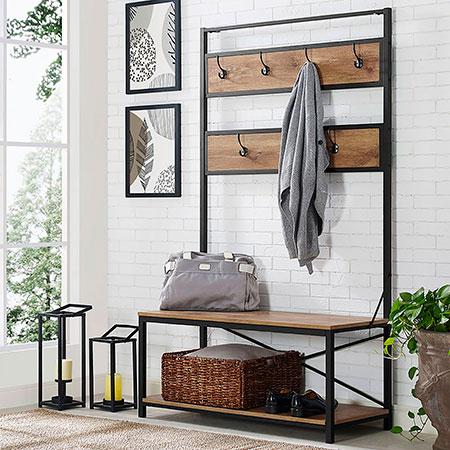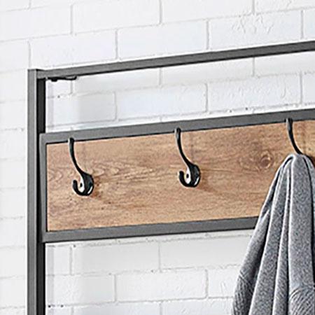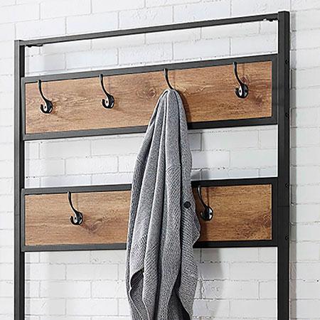 Данная прихожая выполнена с вешалкой, крючки которой расположены в два ряда. Каркас изделия выполнен из прочного металла с окраской черного матового цвета. Отличный дизайн дополняется полкой из натурального дуба. Снизу так же имеется полка, которая выполняет роль подставки для обуви.
