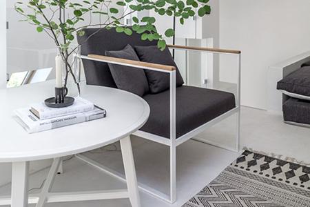 Для уютной зоны отдыха были предложены оригинальные кресла из металла с дубовыми подлокотниками. Кресла были изготовлены